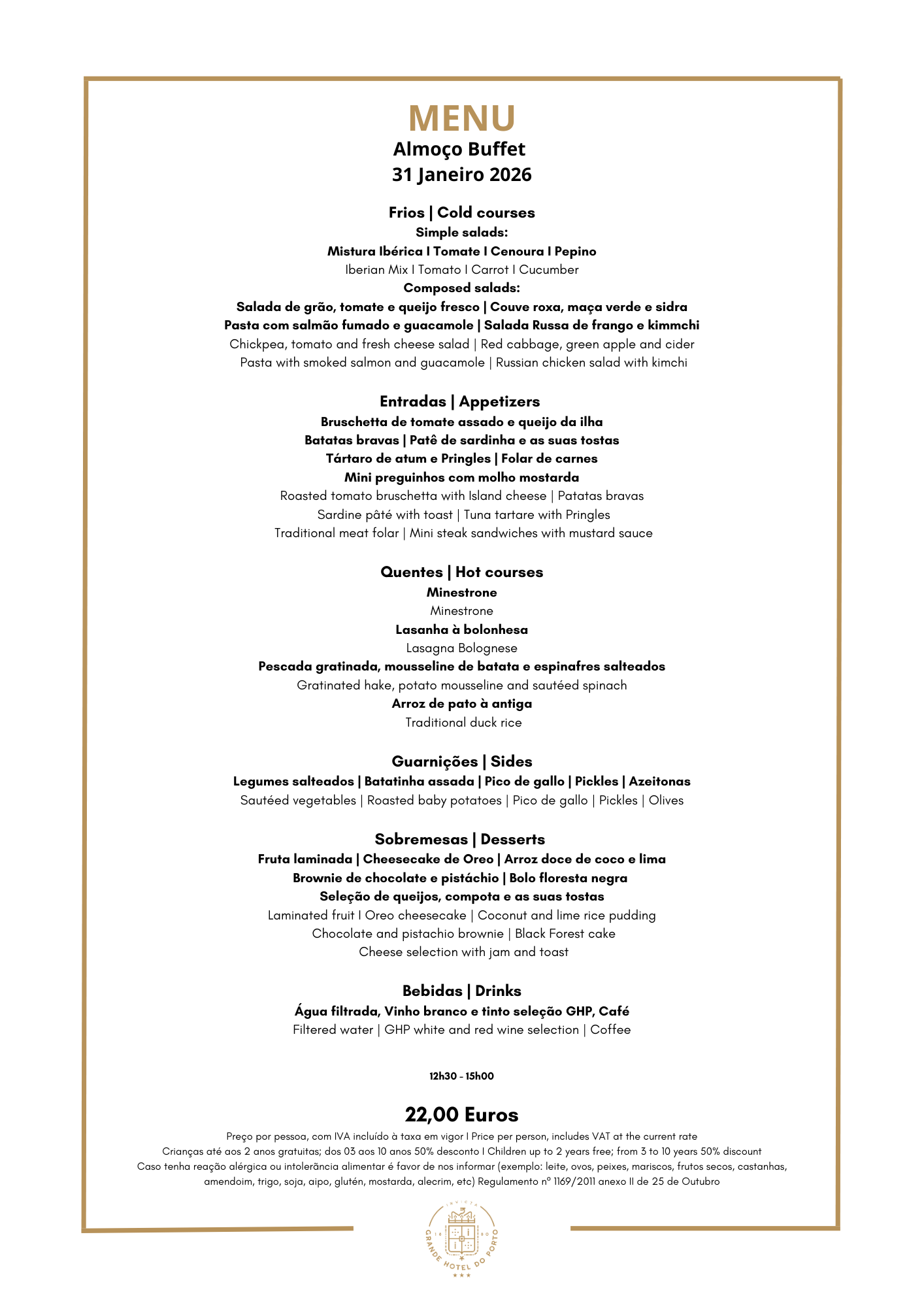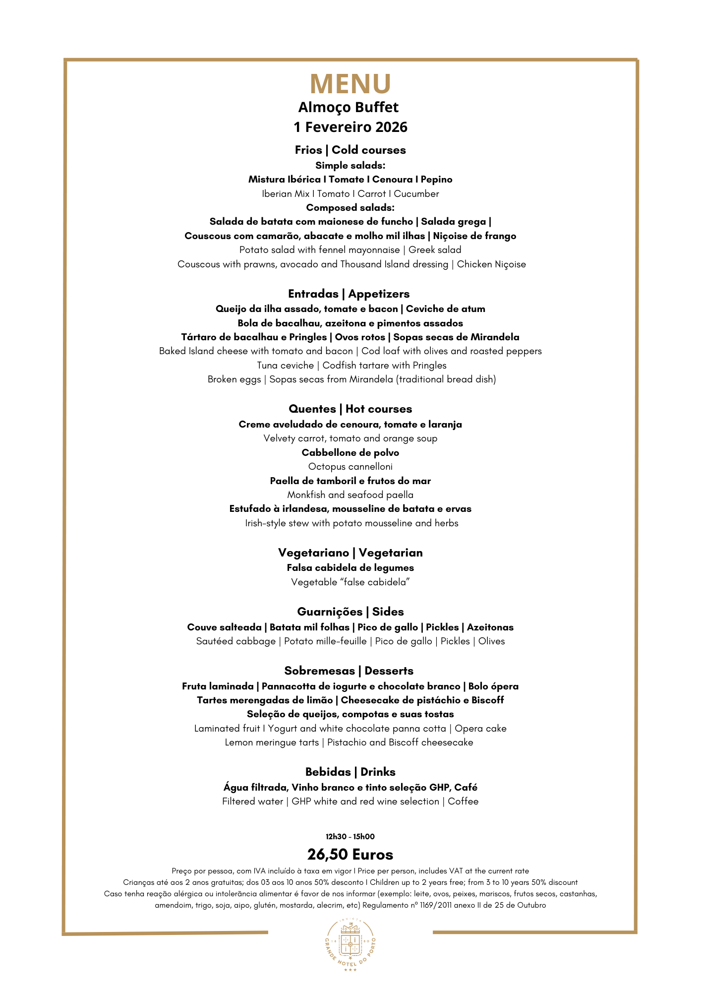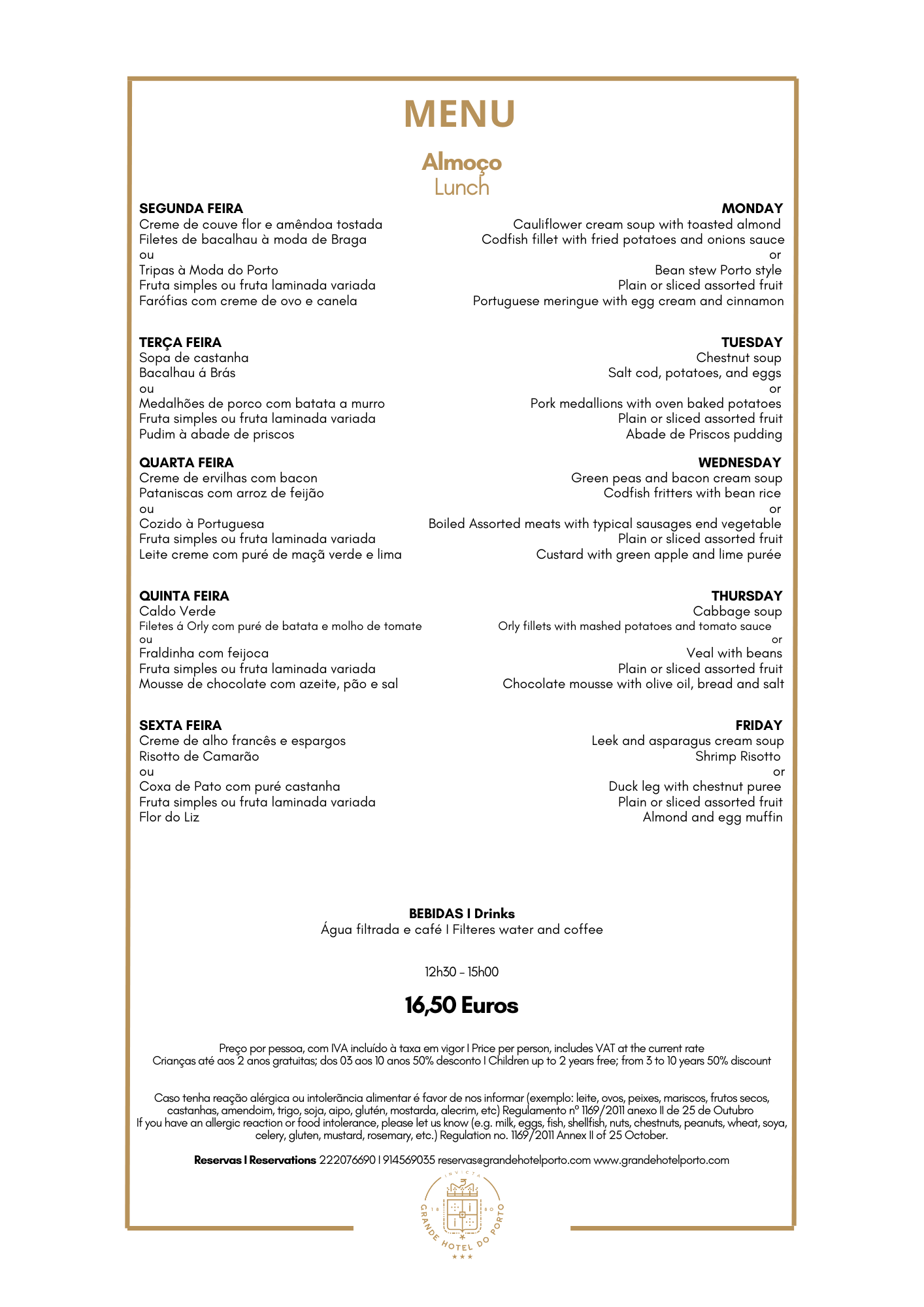 Weekly Menu of Grande Hotel do Porto in Porto. Official Website.